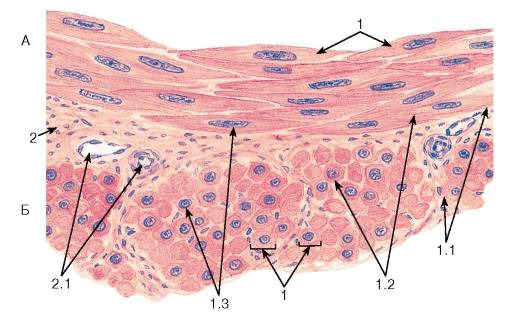 1 - гладкие миоциты: 1.1 - сарколемма, 1.2 - саркоплазма, 1.3 - ядро; 2 - прослойки рыхлой волокнистой соединительной ткани между пучками гладких миоцитов: 2.1 - кровеносные сосуды