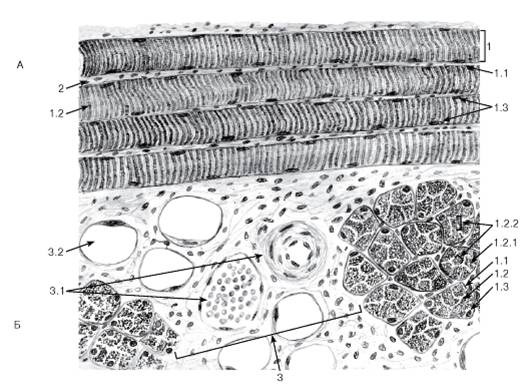 1 - мышечное волокно: 1.1 - сарколемма, покрытая базальной мембраной, 1.2 - саркоплазма, 1.2.1 - миофибриллы, 1.2.2 - поля миофибрилл (Конгейма); 1.3 - ядра мышечного волокна; 2 - эндомизий; 3 - прослойки рыхлой волокнистой соединительной ткани между пучками мышечных волокон: 3.1 - кровеносные сосуды, 3.2 - жировые клетки