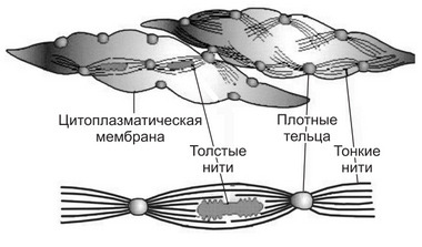 Для последнего характерно высокоупорядоченное расположение актиновых и миозиновых миофиламентов, создающее оптимальные условия для их взаимодействия. Это достигается связью сократимых структур с особыми элементами цитоскелета и плазмолеммой (сарколеммой), выполняющими опорную функцию.
