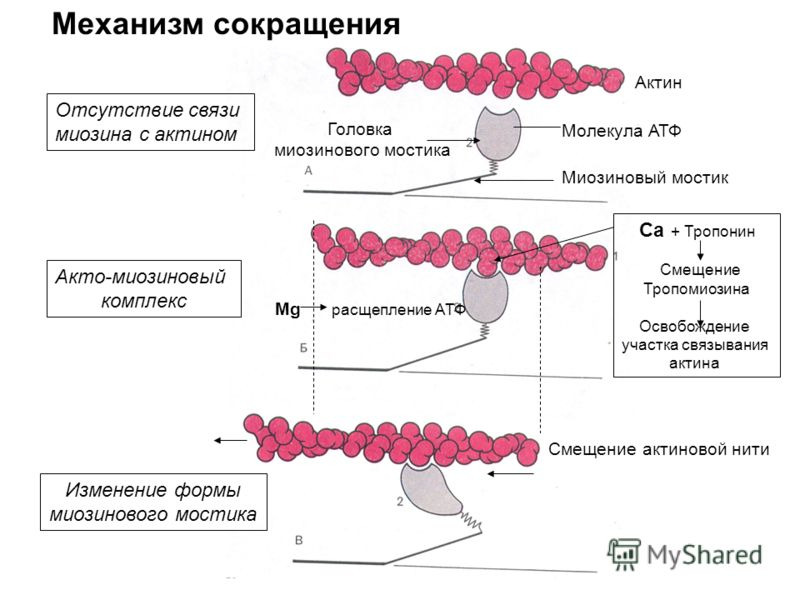 Механизм мышечного сокращения описывается теорией скользящих нитей, согласно которой укорочение каждого саркомера (а, следовательно, миофибрилл и всего мышечного волокна) при сокращении происходит благодаря тому, что в результате взаимодействия актина и миозина в присутствии кальция и АТФ тонкие нити вдвигаются в промежутки между толстыми без изменения их длины.