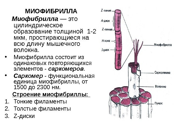 Саркомер (миомер) является структурно-функциональной единицей миофибриллы и представляет собой ее участок, расположенный между двумя телофрагмами (линиями Z). Он включает анизотропный диск и две половины изотропных дисков - по одной половине с каждой стороны . Саркомер образован упорядоченной системой толстых (миозиновых) и тонких (актиновьх) миофиламентов. Толстые миофиламенты связаны с мезофрагмой (линией М) и сосредоточены в анизотропном диске,