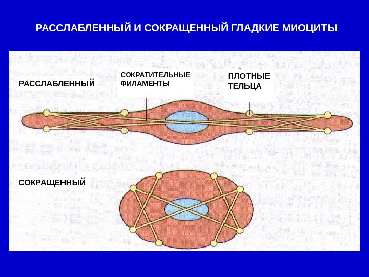Актиновые миофиламенты прикрепляются в саркоплазме к овальным или веретеновидным плотным тельцам - структурам, гомологичным линиям Z в поперечнополосатых тканях; сходные образования, связанные с внутренней поверхностью сарколеммы, называют плотными пластинками.