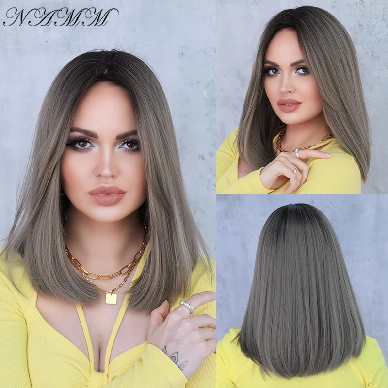 "NAMM Medium Straight Wigs Ash Gray Brown Color Women Wigs Middle Part Bangs Synthetic Wig Heat Resistant Wigs Cosplay Fake Hair" * Buy Now Just For 24$