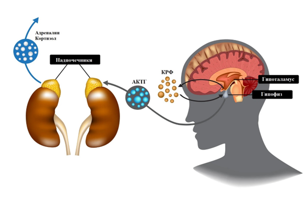Основной естественный ответ человеческого организма на боль – это реакция «бей или беги». Она обеспечивается активацией гипоталамо-гипофизарно-адреналовой оси: гипоталамус (часть мозга) выделяет кортикотропин-рилизинг фактор (КРФ) в гипофиз, который расположен под гипоталамусом, а тот, в свою очередь выделяет андренокортикотропный гормон (АКТГ) в кровь. АКТГ доходит до надпочечников и вызывает выделение гормонов стресса: кортизола и адреналина. Адреналин, в свою очередь, активирует симпатическую нервную систему, что выражается в увеличении частоты пульса, оттоке крови от внутренних органов к периферии и повышении мышечной активности.