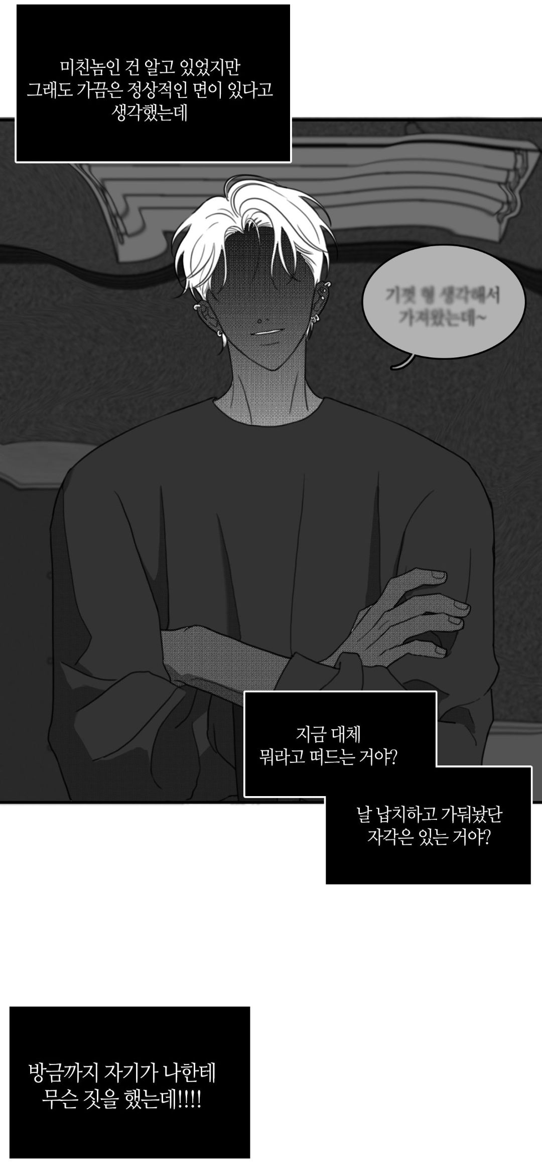 [Я знал, что он сумасшедший, но все же иногда надеялся, что у него есть здравый смысл. О чем ты, черт возьми, говоришь? Ты хоть понимаешь, что со мной сделал, похитив и держа в плену?!!!!]