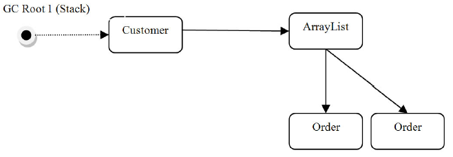 Как вы можете видеть, корень GC присутствует в стеке, указывая на объект ссылки на клиента. Он содержит коллекцию ArrayList заказов, на которую ссылается объект Customer. Сама коллекция также содержит ссылки на ее элементы, поэтому дерево растет.