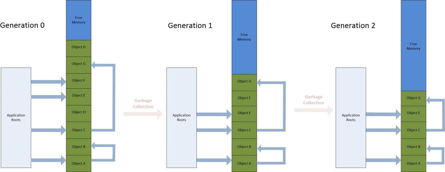 Что также важно отметить, так это то, что после каждого поколения сборки нулевое поколение становится пустым (не содержит объектов). Поколение 1 все еще может содержать объекты, продвигаемые из поколения 0, а поколение 2 может содержать объекты с длительным сроком службы.