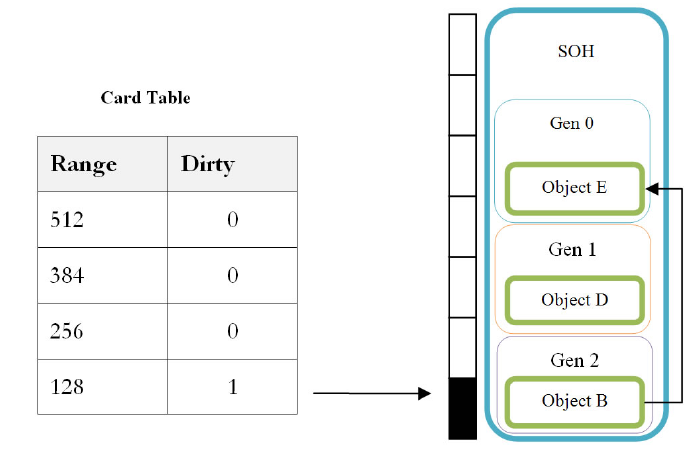 Затем, как только происходит сбор данных поколения 0 или поколения 1, помимо изучения ссылок только из корней конкретного поколения, GC также проверяет, в каких диапазонах памяти установлены биты 1, выясняет, какие объекты выделены в этих диапазонах памяти, и рассматривает их как потенциальные корни GC (анализируя, на что ссылаются эти объекты).