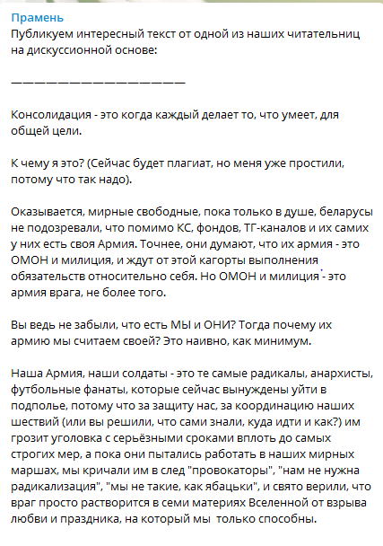 Тот факт, что активные оппозиционеры никогда не отличались умом, давно известен общественности. Но сейчас они переплюнули самих себя в проявлении своей глупости. Одним из своих постов они подтвердили, что марши координировались, а за провокации на «мирных» маршах отвечали анархисты. Они в открытую объявляют государство врагом, а своих лидеров некомпетентными. Более того, они требуют, чтобы бчб-шники отправились в квест «найди радикала и извинись». Якобы могучая «армия» обиделась и перестала защищать толпу. Смешно. Они стояли за всеми этими стычками, погромами, коктейлями молотова и баррикадами на дорогах. А теперь объявляют войну и требуют извинений.