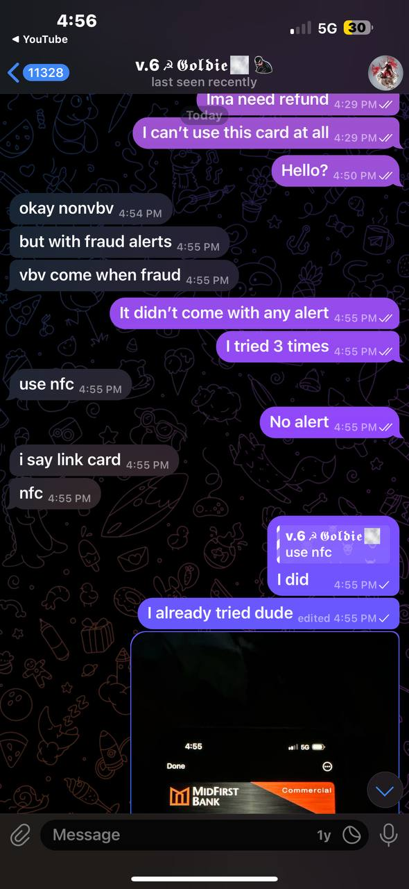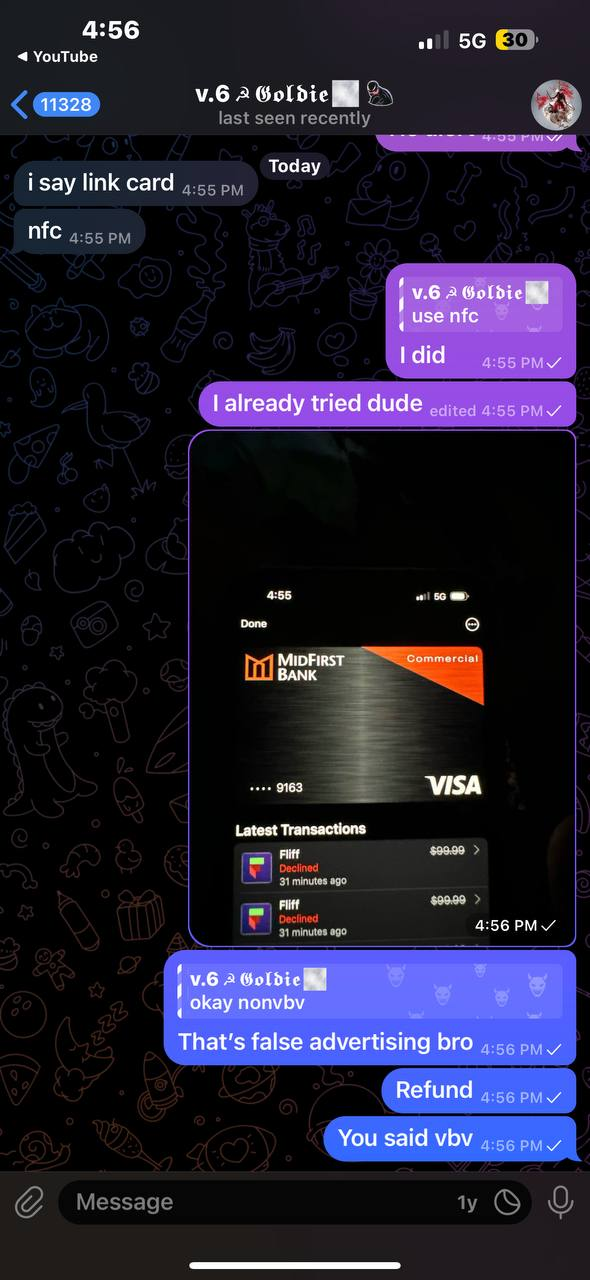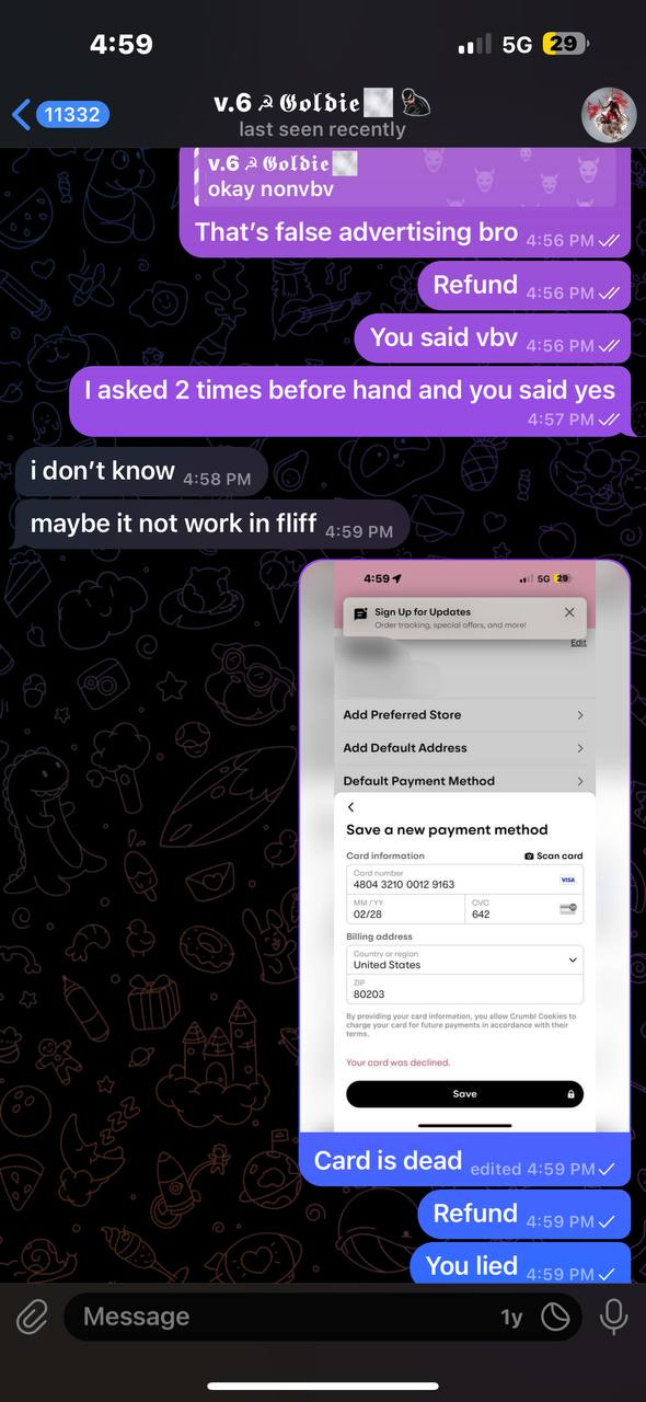 LIAR + SCAMMER HE SOLD ME CARD CLAIMED IT WAS VBV BUT ITS NON VBV AND HE CLAIMED I GET EMAIL NOTIFICATION BUT I NEVER DID HE A RIPPER❌