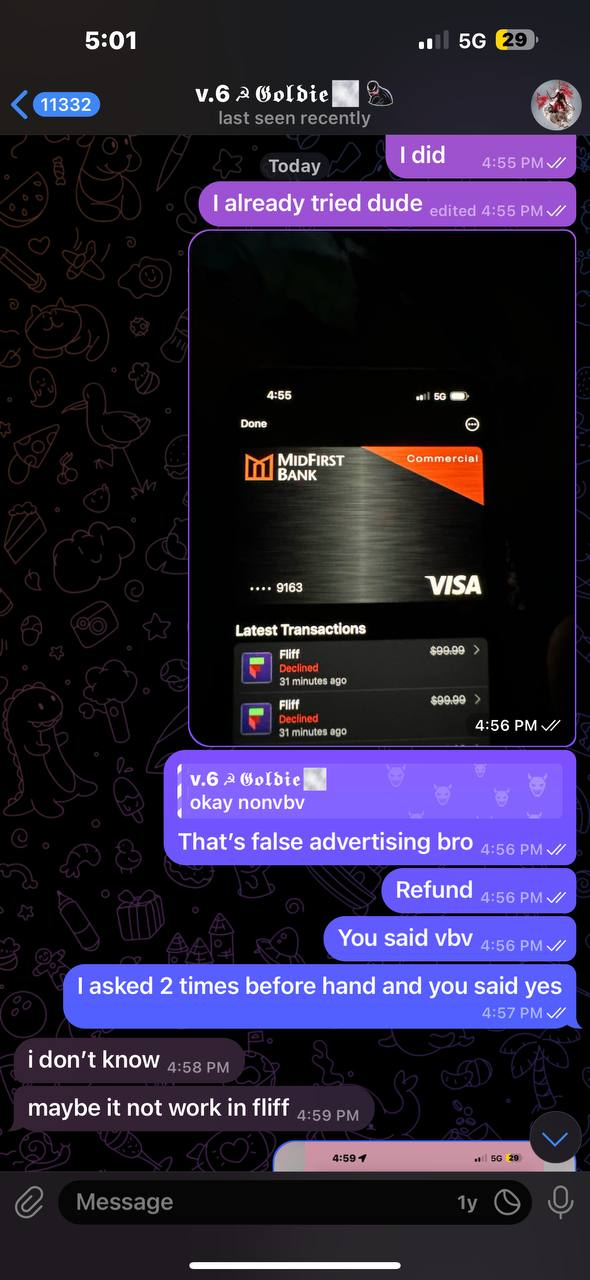 Then I used the card with the merchant fliff, fliff processor is paysafe which is known 100% to be a 3D security merchant, but the card was NON VBV so I couldn’t receive email code like he claimed and mentioned in one of the photos