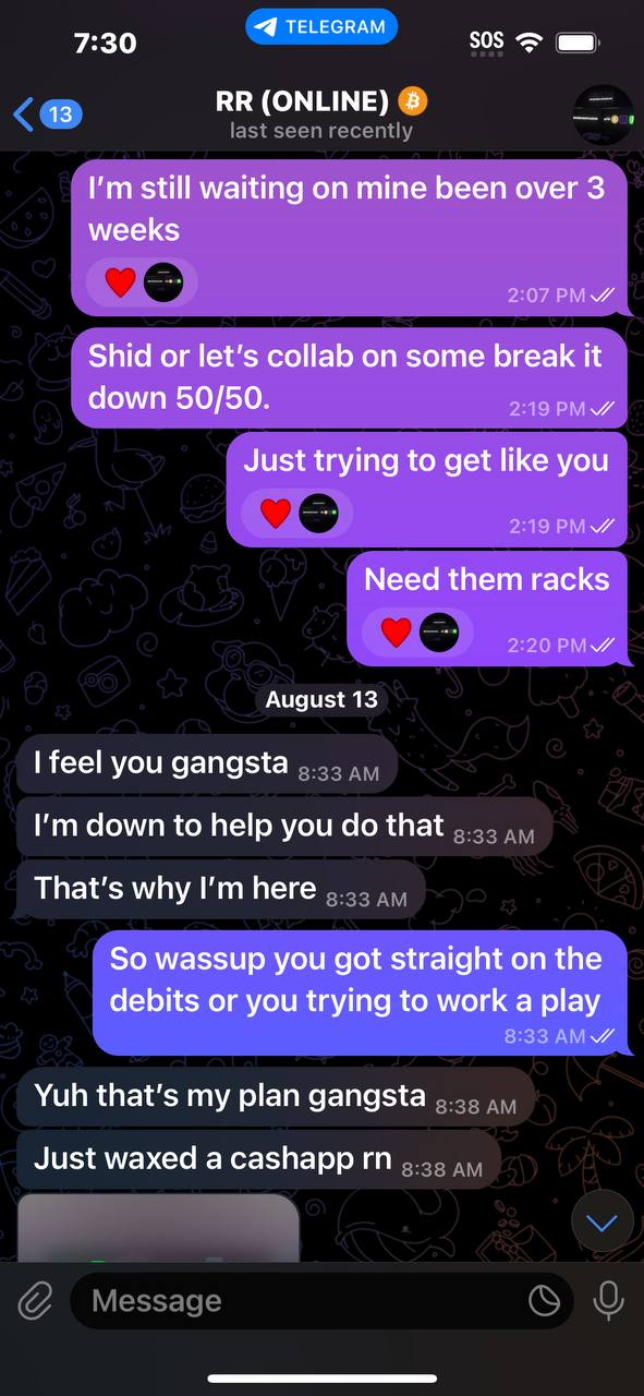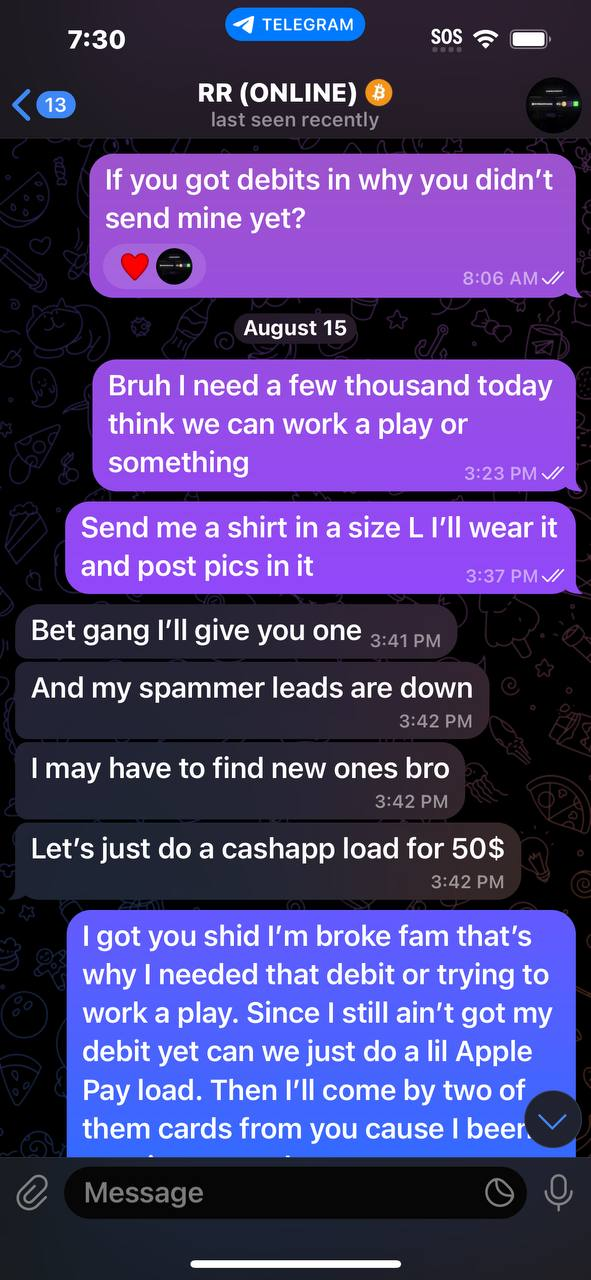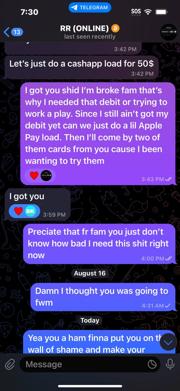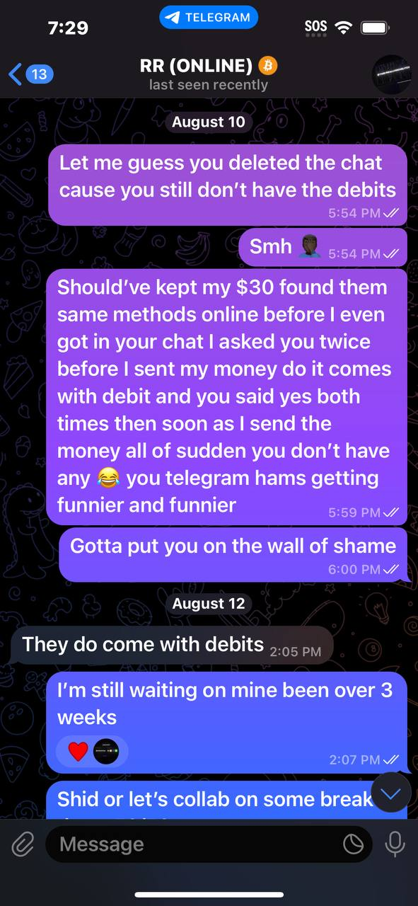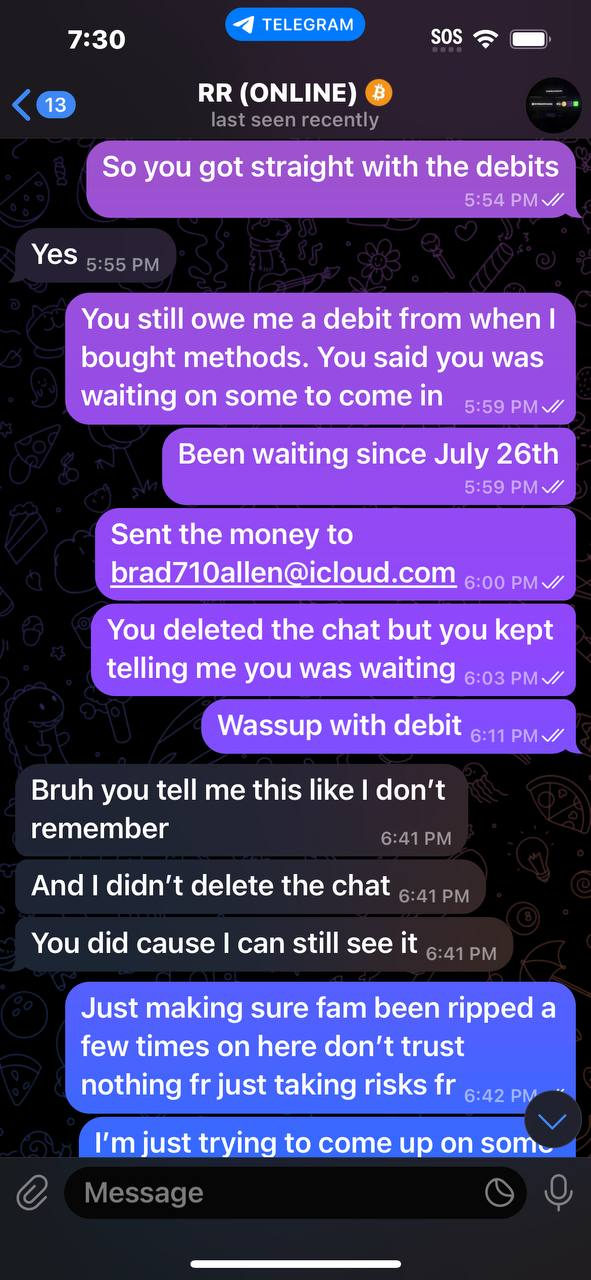 NEW REPORT #2460He ran off with $30 never sent debit say he was waiting but that been over a month now then he post in his channel he got some but never sent mine then tried to make me send more moneyDeleted chat and allHad to rewrite himhttps://t.me/cashedfunds
