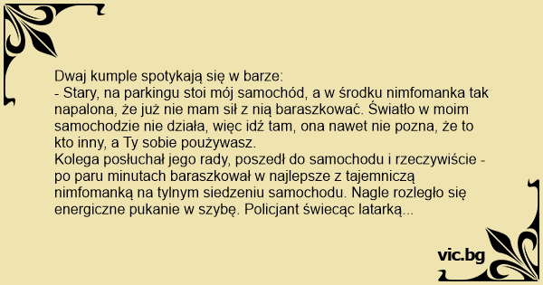 Dwaj kumple spotykają się w barze: - Stary, na parkingu stoi mój samochód, a w środku nimfomanka tak napalona, że już nie mam sił z nią baraszkować . Światło w moim samochodzie nie działa, więc idź tam, ona nawet nie pozna, że to kto inny, a ty sobie poużywasz .