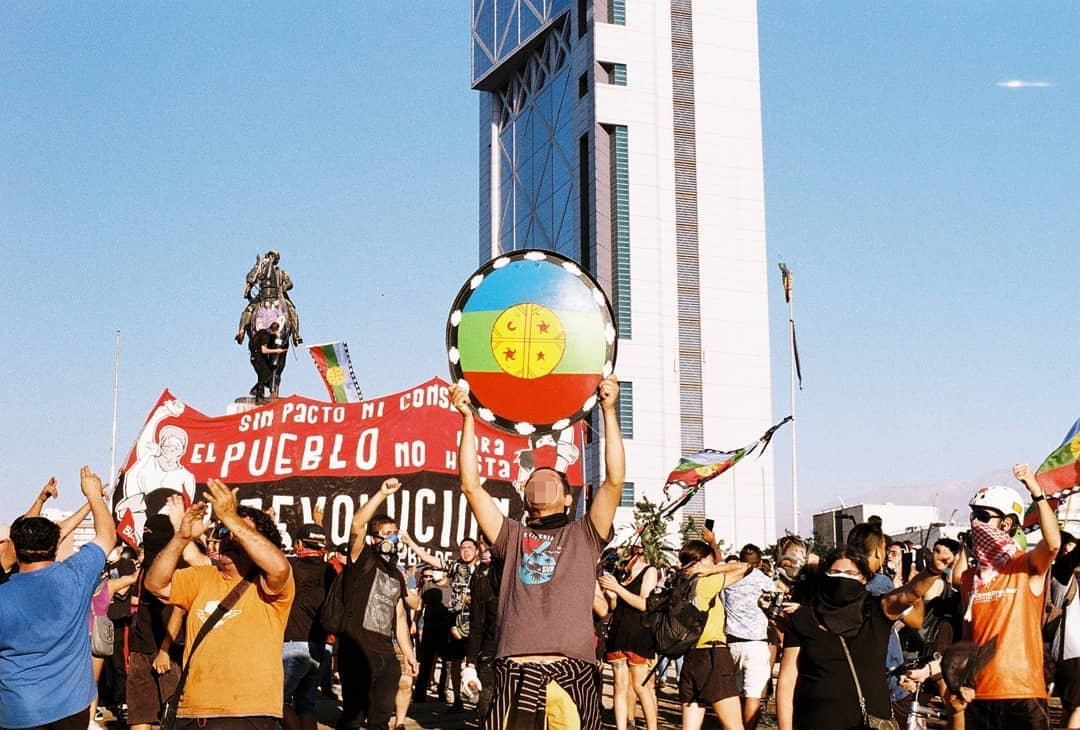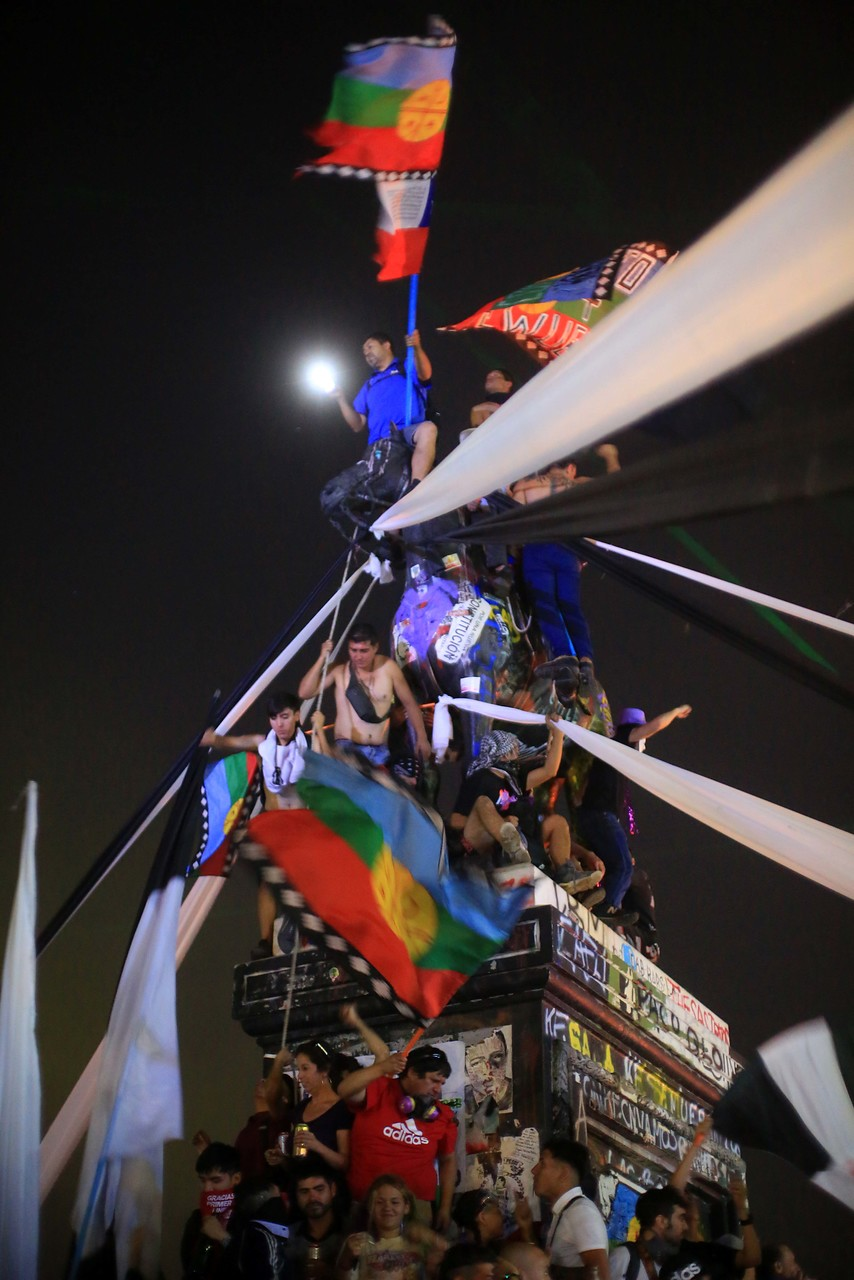 Desde muy temprano, el monumento que homenajea al general Baquedano, quien en el siglo XIX ocupara a sangre y fuego la Araucanía, comenzó a poblarse de jóvenes de la “primera linea” con banderas chilenas y mapuche. En un momento hubo un intento de desmonumentalizar pero como suele suceder, estos personajes a los que homeajea la derecha en cada país (en Argentina pasa lo mismo con el conocido genocida Julio A. Roca) son difíciles de tirar abajo, pero como dijo un “cabro” que pujaba con sus compañeros tirando de una cuerda amarrada a la cabeza del general, “tarde o temprano van a caer como le pasará a Piñera”.