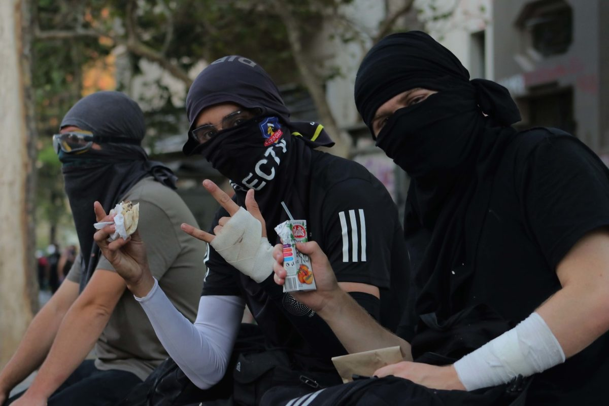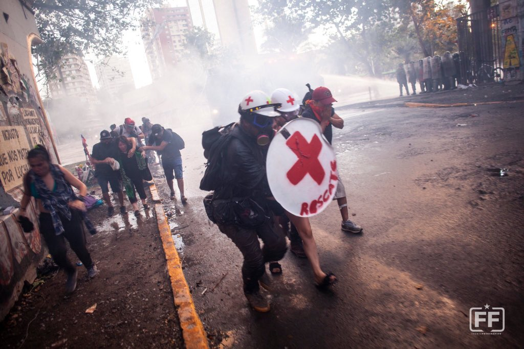 Un par de horas después el bullicio comenzó a crecer, en grupos pequeños o encolumnados comenzaron a llegar infinidad de personas, y comenzaron a servirse las primeras comidas para los “primera línea”. Estos, sin abandonar sus capuchas y escudos confraternizaban con sus colegas, o con gente de todas las edades y condiciones sociales que les expresaban su admiración y respeto “por todo lo que nos protegen y ayudan cuando venimos aquí a protestar contra el culiao de Piñera”, según una trabajadora de la salud. Algunos comunicadores "de confianza" (Resumen Latinoamericano entre ellos) con credenciales especiales pudimos recoger sus testimonios de vida y lucha: “No somos delincuentes como nos acusa la derecha y los medios, somos luchadores, rebeldes, revolucionarios que estamos hartos que se maltrate a los estudiantes, a los jubilados, al pueblo en general”. Más abrazos, más sonrisas, más comentarios, asegurando que “hoy los pacos culiaos no van a entrar aquí y esto para nosotros es una victoria”, según una “cabra” de poco más de 18 años, ataviada de negro que estrechaba la mano de su compañerito de similar edad que lucía un escudo con la frase: “primera línea de amor”. Sí, porque si hay algo que sobra entre estos jóvenes es el amor que entregan a diario para defender con sus cuerpos las ansias de manifestarse en paz que tiene la mayoría que gana las calles. Por eso, el respeto con que se acercan a ellos y ellas, personas de todas las edades, con un gesto agradecido o una palmadita en el hombro de una abuela, susurrándoles: “no aflojen cabros, que estamos con ustedes”.