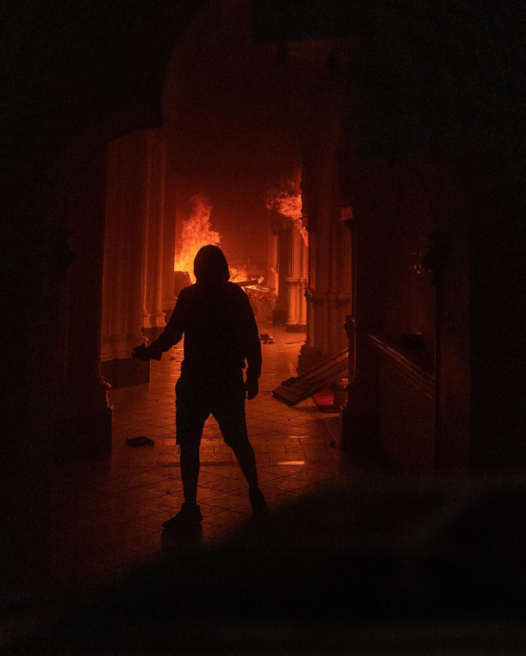 Una iglesia cercana al lugar fue saqueada y sus bancos incendiados en la calle en las barricadas al tiempo que en el otro lado de la calle algunos manifestantes apedrearon un edificio cercano.