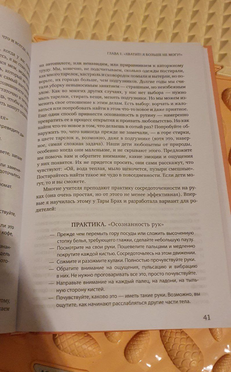 СьюЗен Поллак рассказывает о простых эффективных упражнениях, которые помогут развить в себе эти качества. Выполнение одного упражнения займет не больше трех минут в день (это как чистка зубов). Важна не продолжительность, а регулярность (помните: как чистка зубов?). Кроме того, для практики осознанности не обязательно сидеть неподвижно. Вы можете тренировать осознанность, когда гуляете, ждете в очереди, ведете машину, лежите в кровати, даже когда меняете подгузник. Для этого вам не обязательно находиться в одиночестве и тишине в комнате для медитаций или на вершине горы. Это то, что должно стать частью вашей сумасшедшей жизни, когда вы как родитель пытаетесь успеть за 24 часа всё. Когда вы больше всего в этом нуждаетесь.
