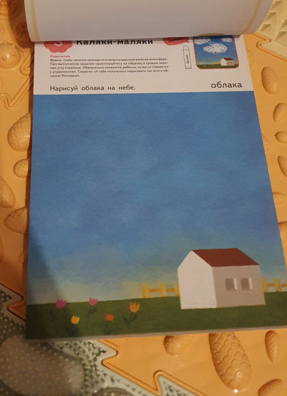 Заверши картинку (№ 35-38). В заданиях этого раздела ребенку нужно дорисовать недостающие детали на картинках, а в самом последнем упражнении он попробует создать собственный рисунок.