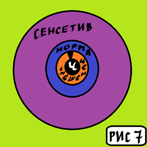 Рис. 7 Он как бы больше чувствует. Т.е. тех, кто больше чувствует, тех вообще называют сенсетивы, т.е. экстрасенсы, т.е. те, кто чувствует все и положительные, и отрицательные поля. Но многие спрашивают: А что тогда - белых сенсетивов не бывает? И белые бывают сенсетивы, но таким образом? Рис.7.У него, белого, было вот поле (рис.31 – сиреневый круг), и он расширяет своё поле до таких размеров Рис.7 (или рис.31 – синий круг), увеличивает. И он чувствует всё, что находится внутри его поля.