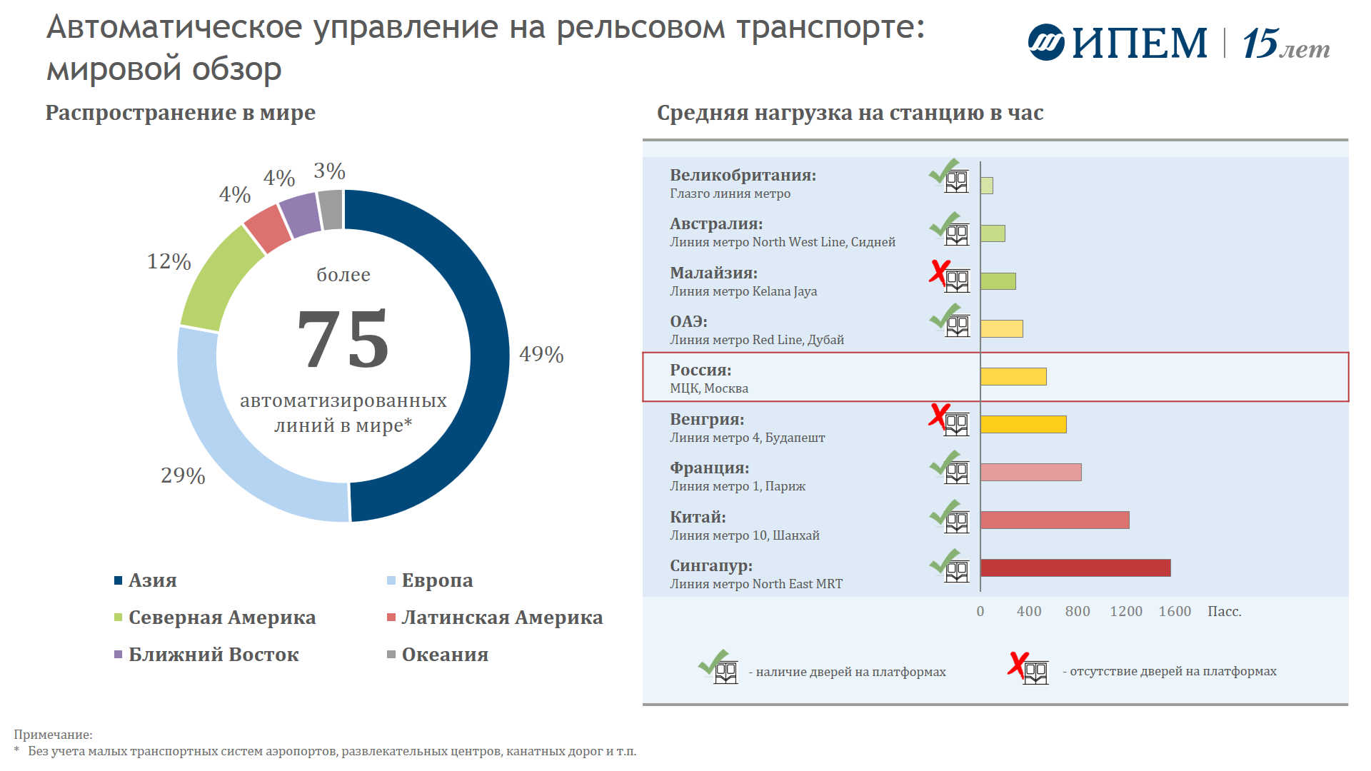 В целом в мире на данный момент функционирует более 75 автоматизированных линий общественного транспорта – без учета малых транспортных систем аэропортов, развлекательных центров и тому подобное. Основными регионами являются Азия и Европа.