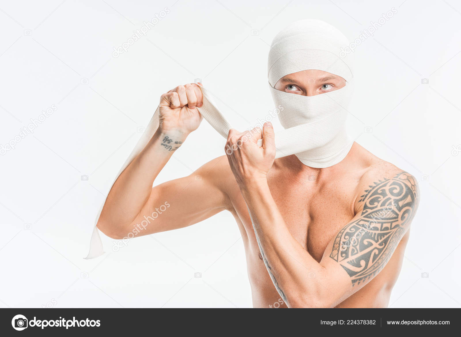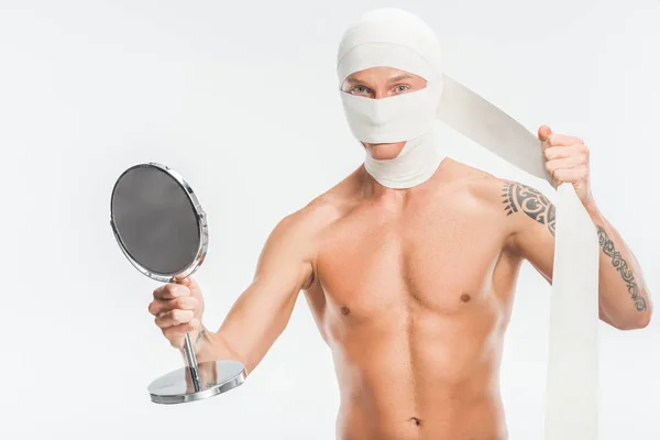 Голый мужчина снимает повязки с головы после пластической операции и смотрит на зеркало, изолированное на белом