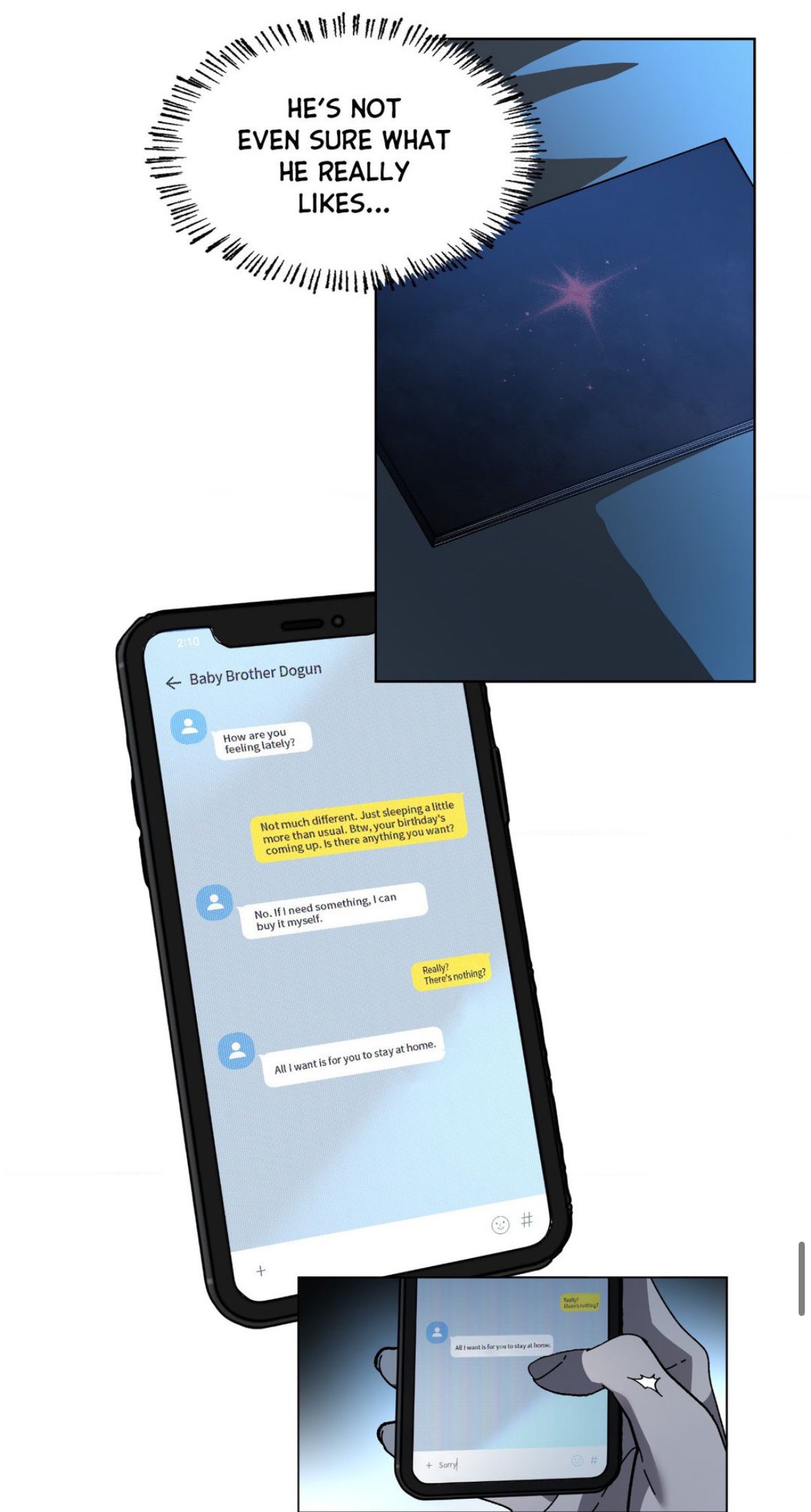 [ - Как ты себя чувствуешь? - Ничего необычного. Только стал больше спать. Кстати, совсем скоро твой день рождения. Хочешь, чтобы я тебе что-нибудь подарил? - Нет. Если я что-то захочу, то куплю сам. - Точно ничего не хочешь? - Всё, о чём я тебя прошу, - оставайся дома. ]