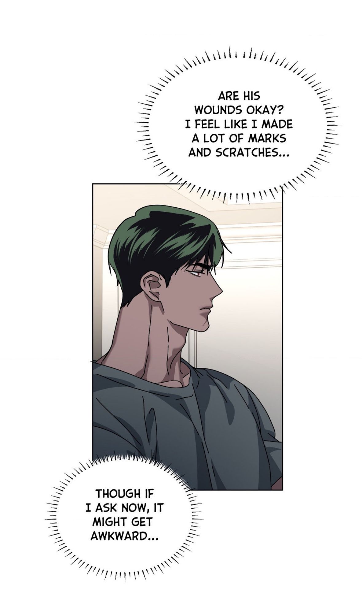 * Надеюсь, его раны уже зажили? Мне показалось, что я сильно поцарапал его. Но если я спрошу об этом прямо, мне будет стыдно... *