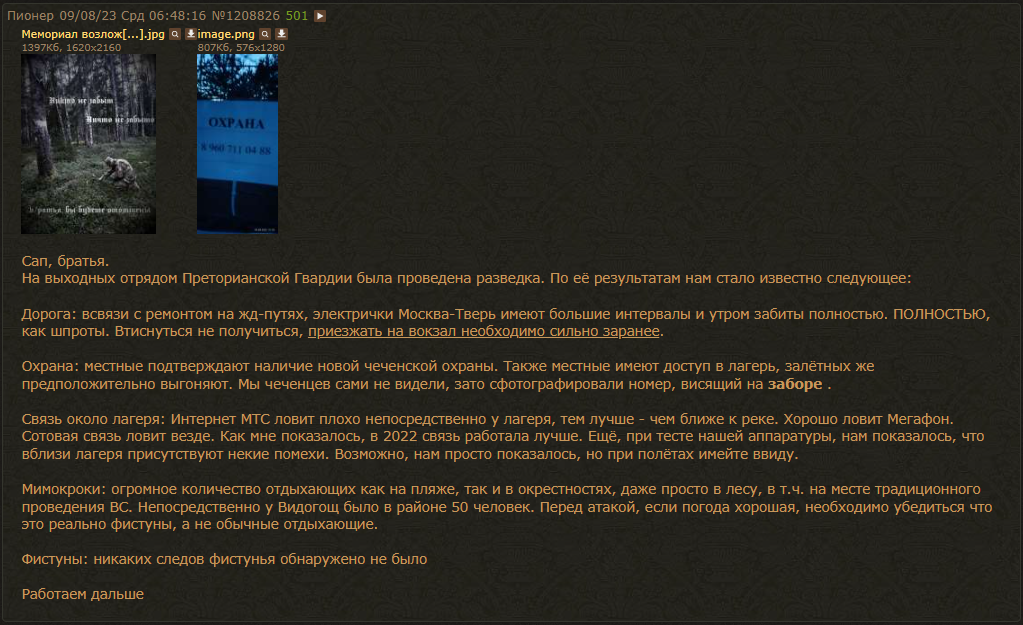 Очень большая часть “инфы” приходит, от каких то “крыс” со стороны фиста, видно им выгодно, что бы набегаторы всё-таки приехали и хорошенько накормили их говном, иначе не могу понять какая выгода у них в том, что бы сливать инфу. Тем более о датах ВС, когда палатки вне базы отдыха и ЧОП не поможет, а набегаторы наоборот злые и понесли недавно значительные потери избитыми, арестованными и сдеаноненными.