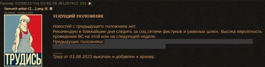 3 августа Архив (анон сохраняющий конетет набегатреда в /es/ на яндекс диске) призвал смотреть за соц. сетями фистунов, и о возможном проведении ВС 4-6 августа или 11-13 августа.