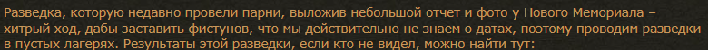 4-6 августа отрядом Преторианской Гвардии (2 набегатора предположительно) была проведена разведка местности с целью выявить фистунов, выявлены они не были.