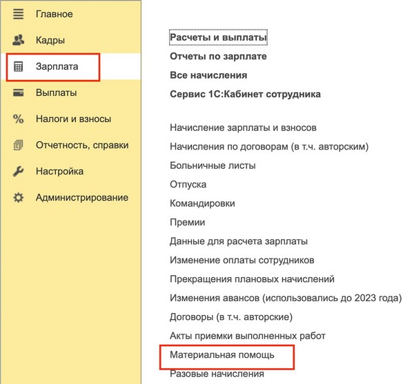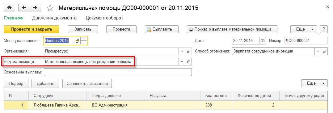 Начислить материальную помощь в зуп