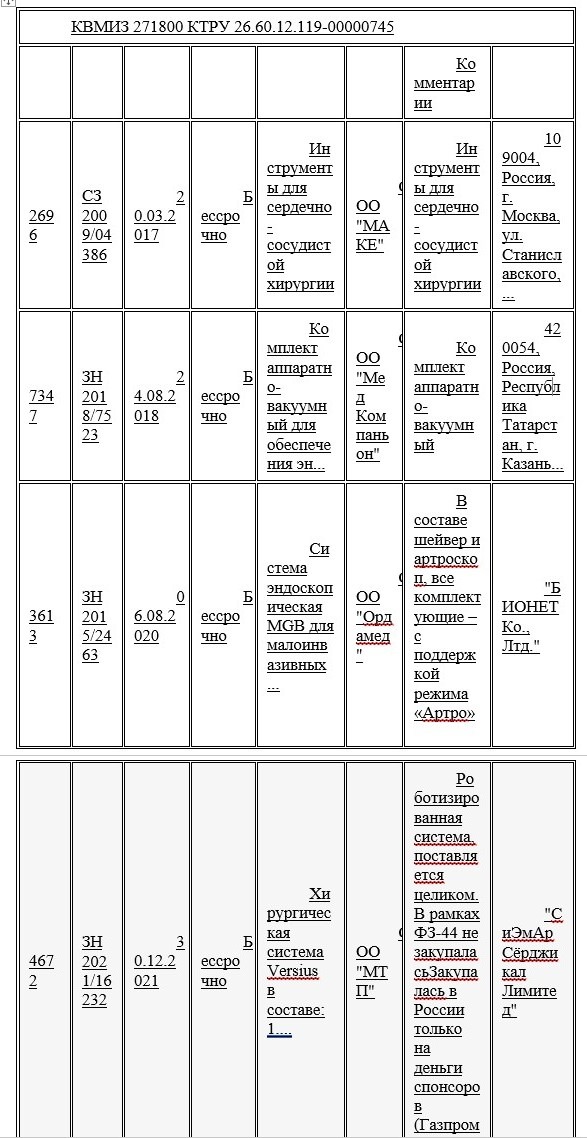 Согласно информации с сайта (Таблица № 1 с комментариями - ниже), под КВМИ 271800 зарегистрированы медицинские изделия, которые имеют в своем составе шарнирные манипуляторы, шейверы и артроскопы, все комплектующие – с поддержкой соответствующих режимов. Такие характеристики полностью соответствуют описанию соответствующего КВМИ, но принципиально отличаются своими характеристиками от объекта закупки, не соответствуют потребности заказчика, изложенной в описании объекта закупки, а также цели закупки в соответствии с условиями Приказа 1379н.: