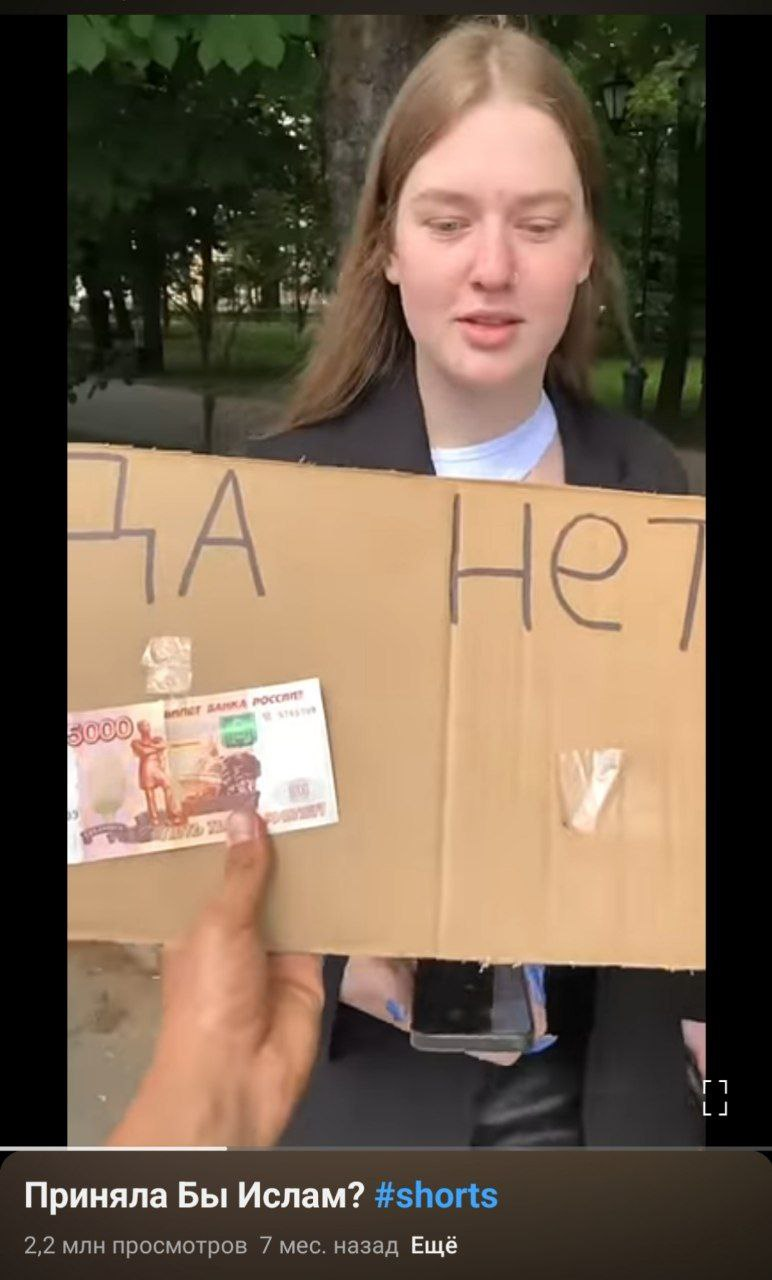 Например, некий Кирилл Шучер подходит к девушкам на улице и задаёт им вопросы: «Надела бы ты хиджаб?», «Читала ли ты Коран?», «Приняла бы ислам?» и т.д.