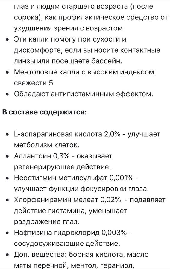 Неостигмин метилсульфат 0,001% - улучшает функции фокусировки глаза . Хлорфенирамин мелеат 0,02% - подавляет действие гистамина, уменьшает раздражение глаз . Нафтизина гидрохлорид 0,003% - сосудосуживающие действие . Доп . вещества: борная кислота, масло мяты перечной, ментол, гераниол, хлорбутанол, хлорид бензалкония, полисорбат 80, рН агент .
