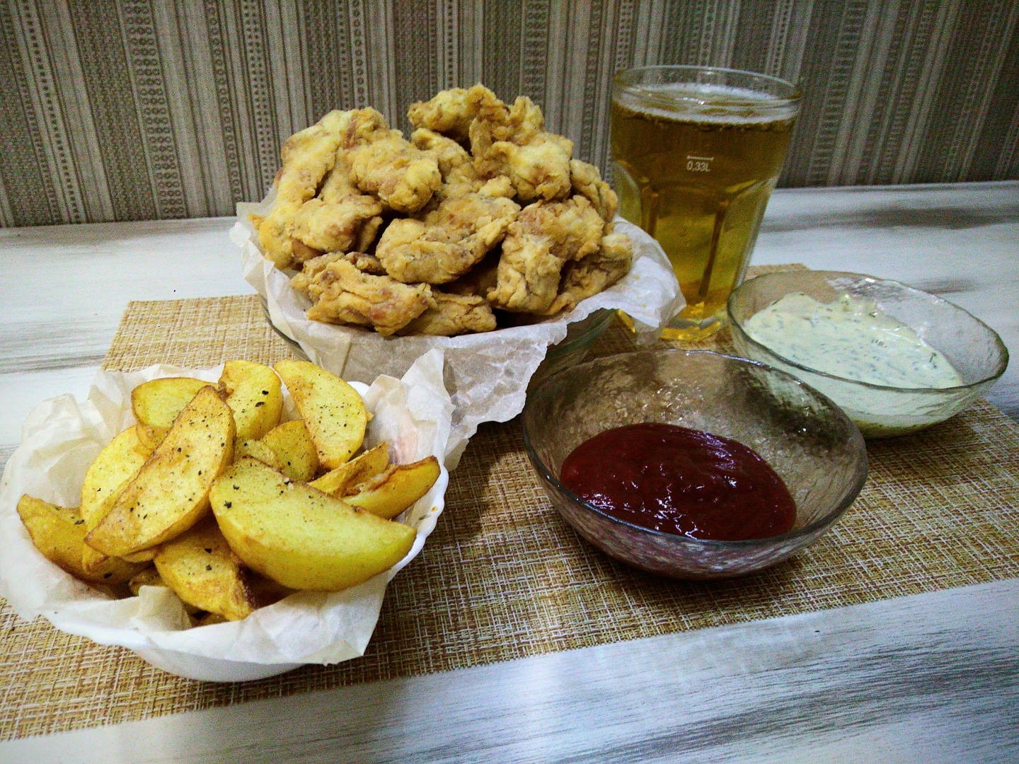 Эту характерную панировку пытаются повторить при помощи кукурузных или овсяных хлопьев, сухарей, чипсов, хотя на самом деле все гораздо проще — в оригинальной панировке “лохмотьями” есть только мука и вода, и как раз ее мы и будем использовать.
