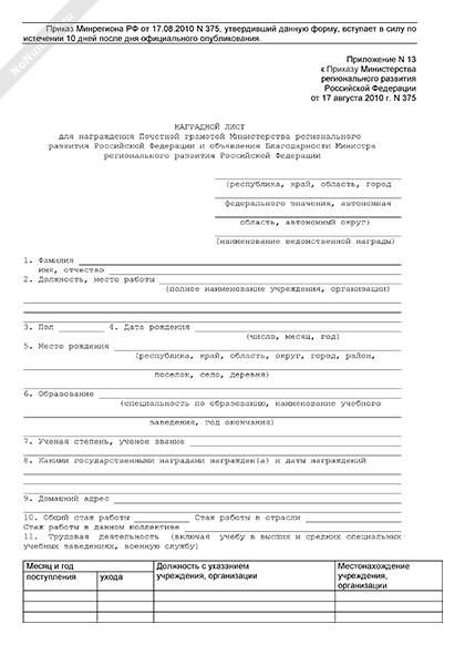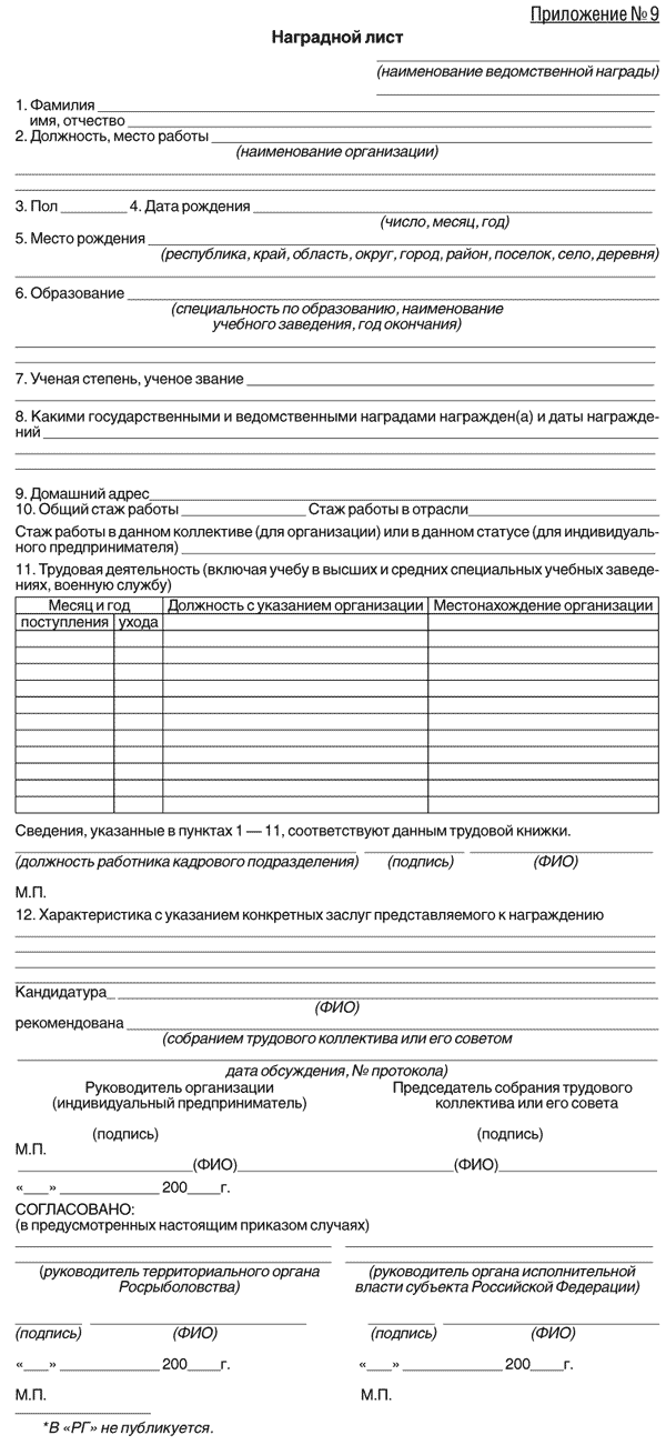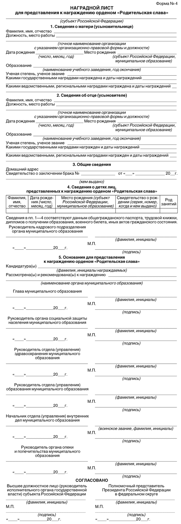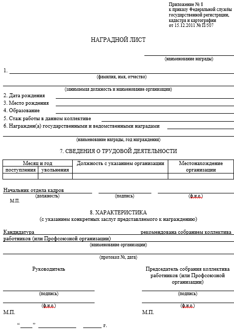 Наградной лист на государственную награду образец 2025