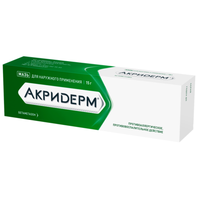 Акридерм крем 0.05% 15г – антипролиферативный, противоаллергический, противовоспалительный и противоотечный препарат на основе бетаметазона. Представляет собой глюкокортикостероид с сосудосуживающим эффектом для наружного применения. Эффективен при ряде кожных заболеваний.