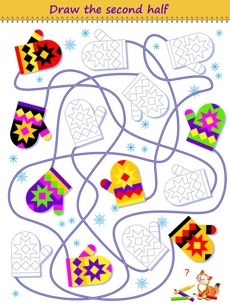 Логическая головоломка игра с лабиринтом . Найти и нарисовать вторую пару каждой варежки . Раскраска . Печатный рабочий лист с упражнениями для детского школьного учебника . iq-тест .
