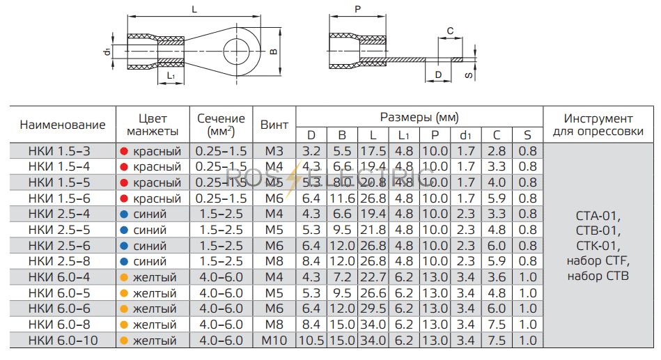 Описание . Тип : НКИ . по ТУ 3424-001-59861269-2004 . Предназначены для оконцевания опрессовкой многопроволочных гибких медных проводов и последующего крепежа наконечников к клеммам электрического оборудования на основе винтовой фиксации . Материал изоляции: самозатухающий ПВХ .