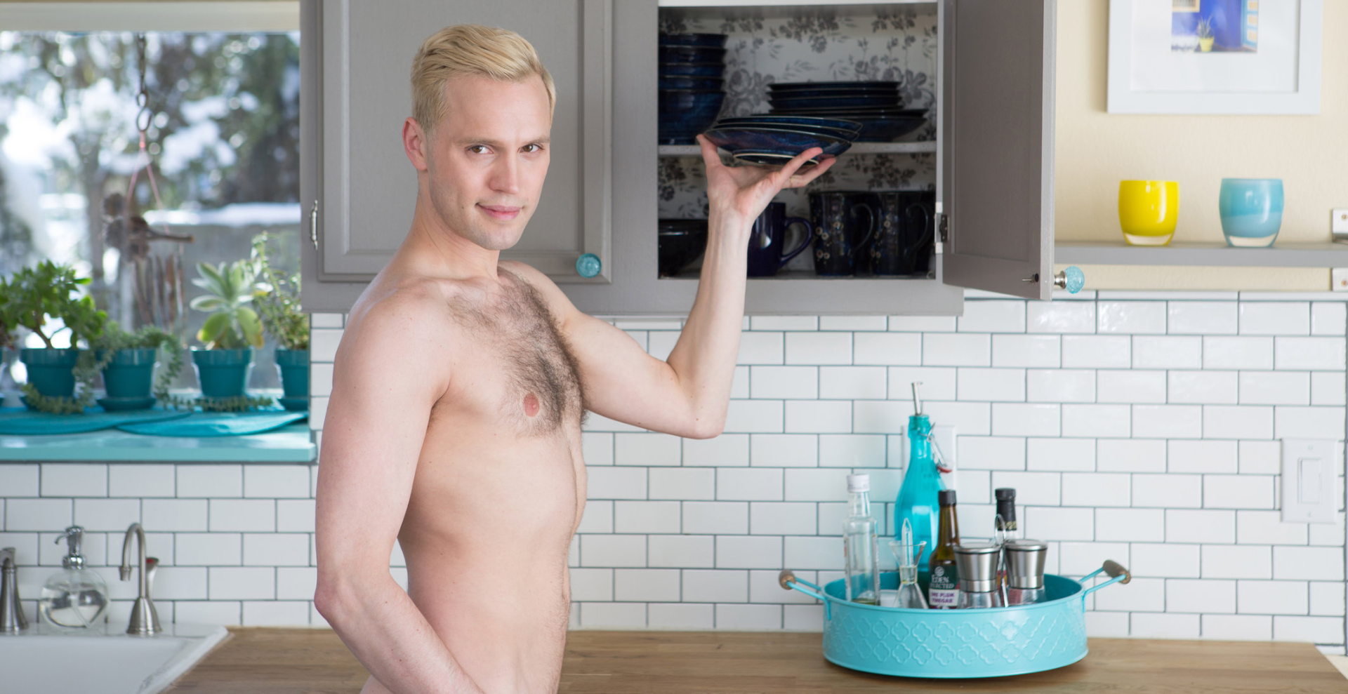 Naked men cleaning house