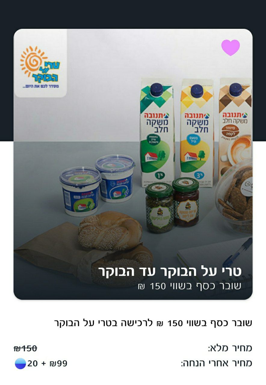 Тари аль а бокер - платформа для формирования корзины продуктов на месяц(обязан заказывать хотя бы один продукт в неделю + 2 шекеля за доставку).▪️Есть возможность создания постоянного/меняющегося списка продуктов.