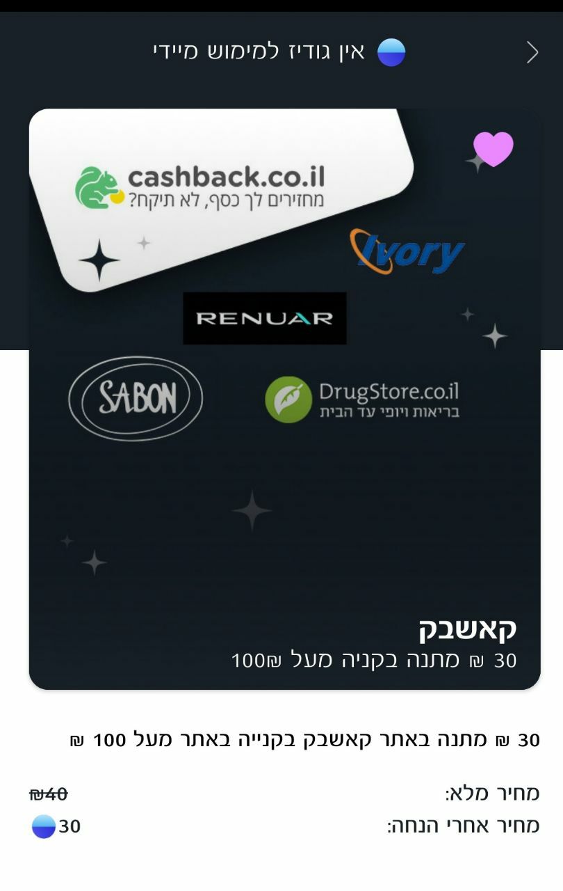 Кэшбек 30 шек при покупке товаров на 100 и более шек по реферальной ссылке на сайте cashback.co.il.
