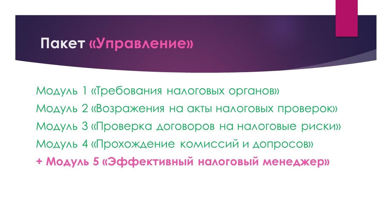 Пакет "Управление " подходит для вас, если, помимо получения экспертных навыков взаимодействия с налоговиками, вы также хотите научиться комплексно управлять налоговыми рисками компании и повысить эффективность своей работы как налогового менеджера.