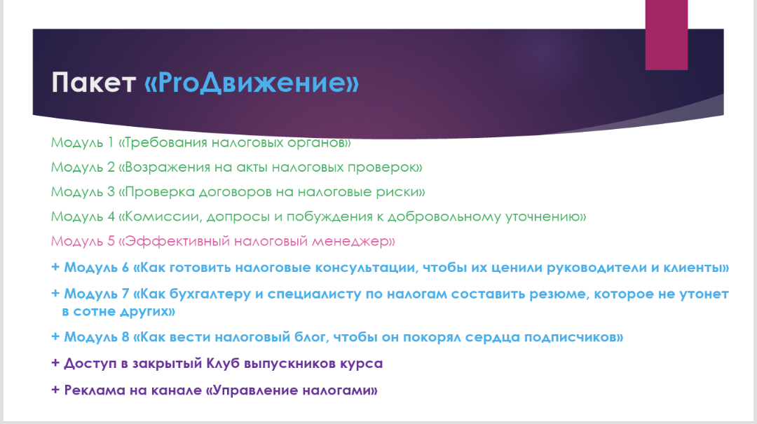 Это максимальный пакет обучения, который содержит в себе все блоки из предыдущих 2 пакетов, и, помимо этого, содержит 3 дополнительных модуля обучения и 2 дополнительные опции, которые призваны помочь Вам в продвижении себя на высококонкурентном рынке налоговых услуг.