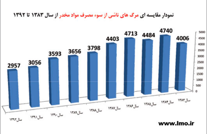نمودار مقایسه ای مرگهای ناشی از سوء مصرف مواد مخدر از سال ۱۳۸۳ تا ۱۳۹۲- منبع: پزشکی قانونی