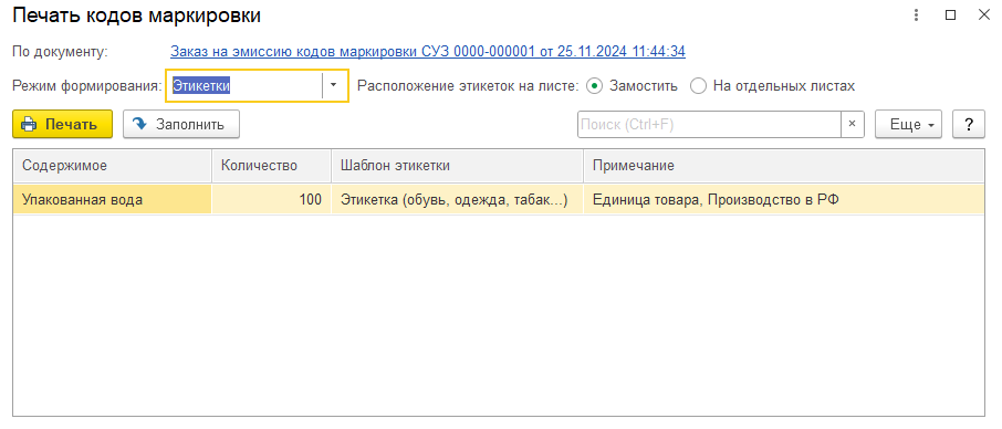 Напечатать коды маркировки