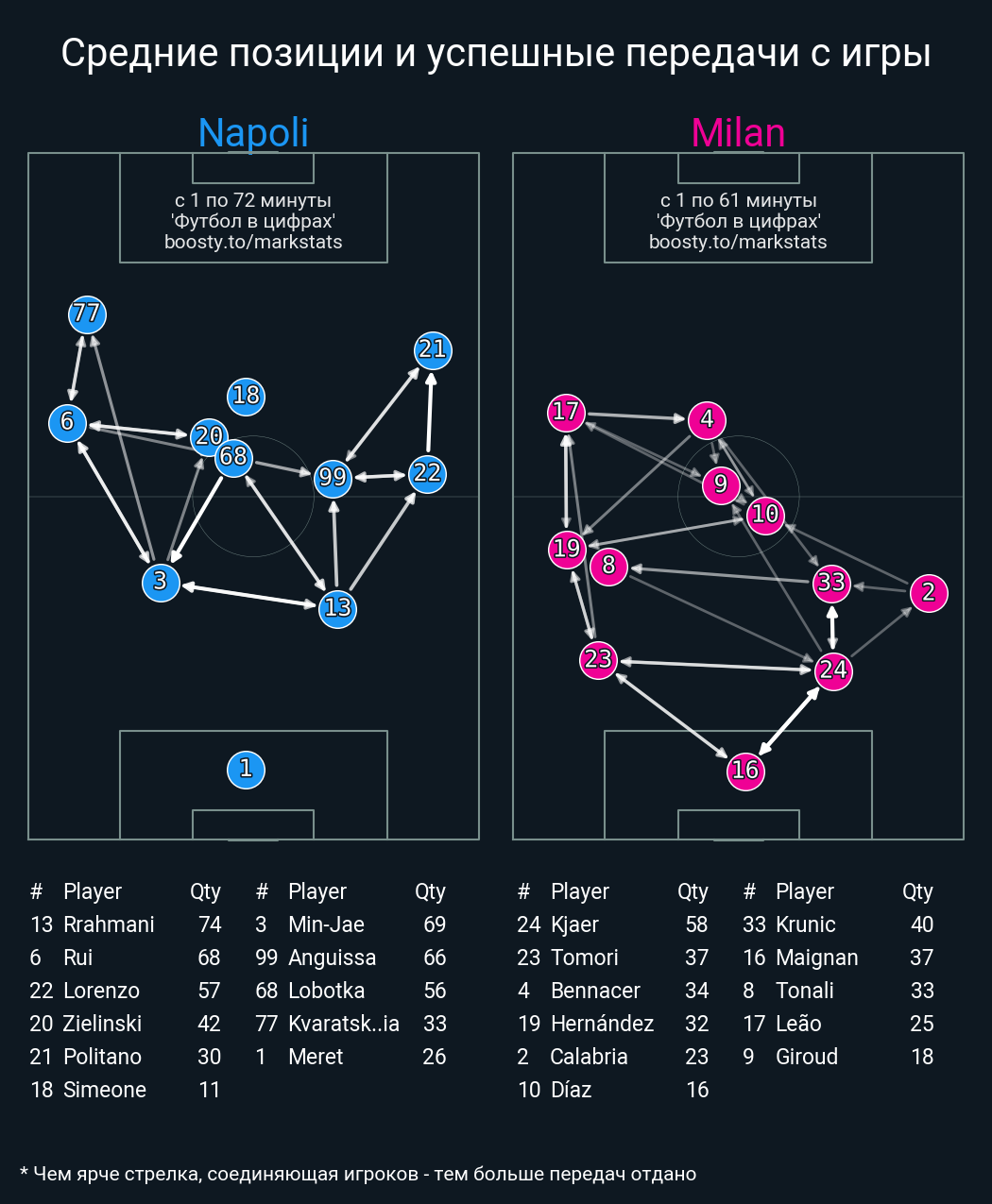 59 успешных передач из 78 попыток (1 под удар, 8 с продвижением, 12 на трети соперника)