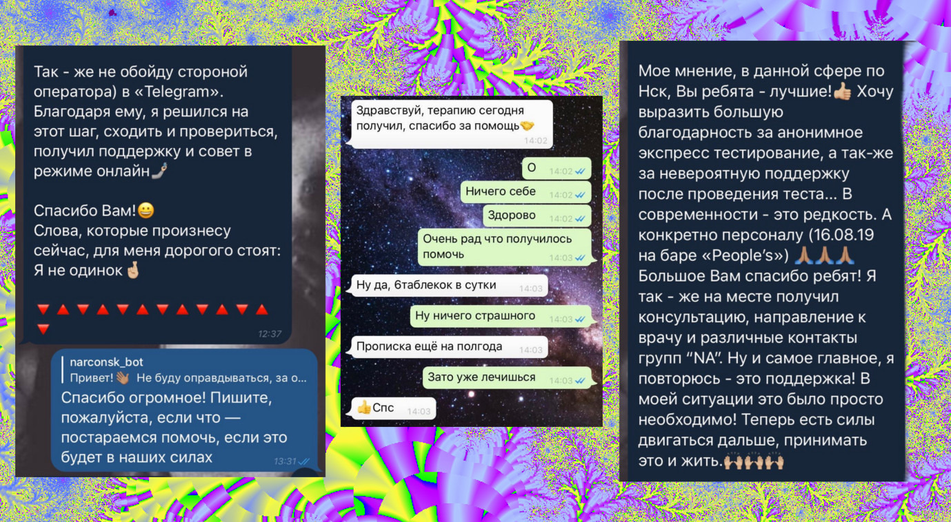 — Этого никогда не было. В чате мы прописали правила, что не рекламируем наркотики, магазины. Мы стараемся объяснять, что наша основная цель — поддержка, взаимопомощь, и люди с этим соглашаются, независимо от того, находятся они в активном употреблении или нет. Мы очень признательны нашим участникам, которые приглашают в чат своих друзей, рассказывают им о канале, о проекте и делятся поддержкой с теми, кому она нужна.