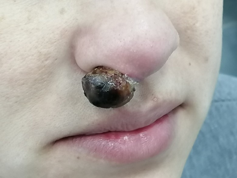 На базалиому носа отводится около 80% клинических случаев заболевания . Базалиома кожи носа считается одной и самых щадящих форм рака Начальная стадия базалиомы на носу, как видно на фото, характеризуется появлением на коже поверхностного узловатого повреждения . . .