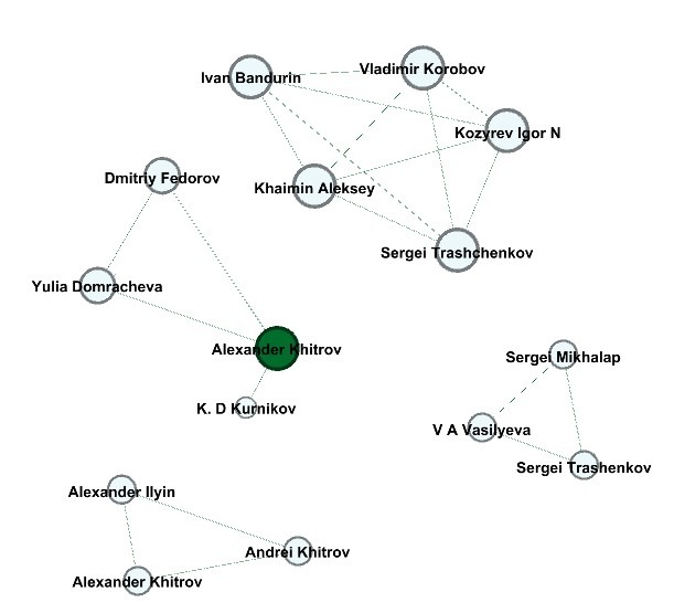 За рассмотренный период было выявлено 4 исследовательские группы из ПсковГУ. Все работы написаны по тематике электроэнергетики. Отдельно стоит отметить, что за исключением одной группы, где был приглашен внешний автор, все работы писались коллективом работников ПсковГУ. Цвет узла отображает характеристику «Степень посредничества», чем он более насыщен, тем большую роль при коммуникации играет данный узел. Видно, что почти во всех группах нет дифференциации по коммуникации. В то же время, в одной из групп присутствует 1 автор, который является ключевым посредником для данной группы.